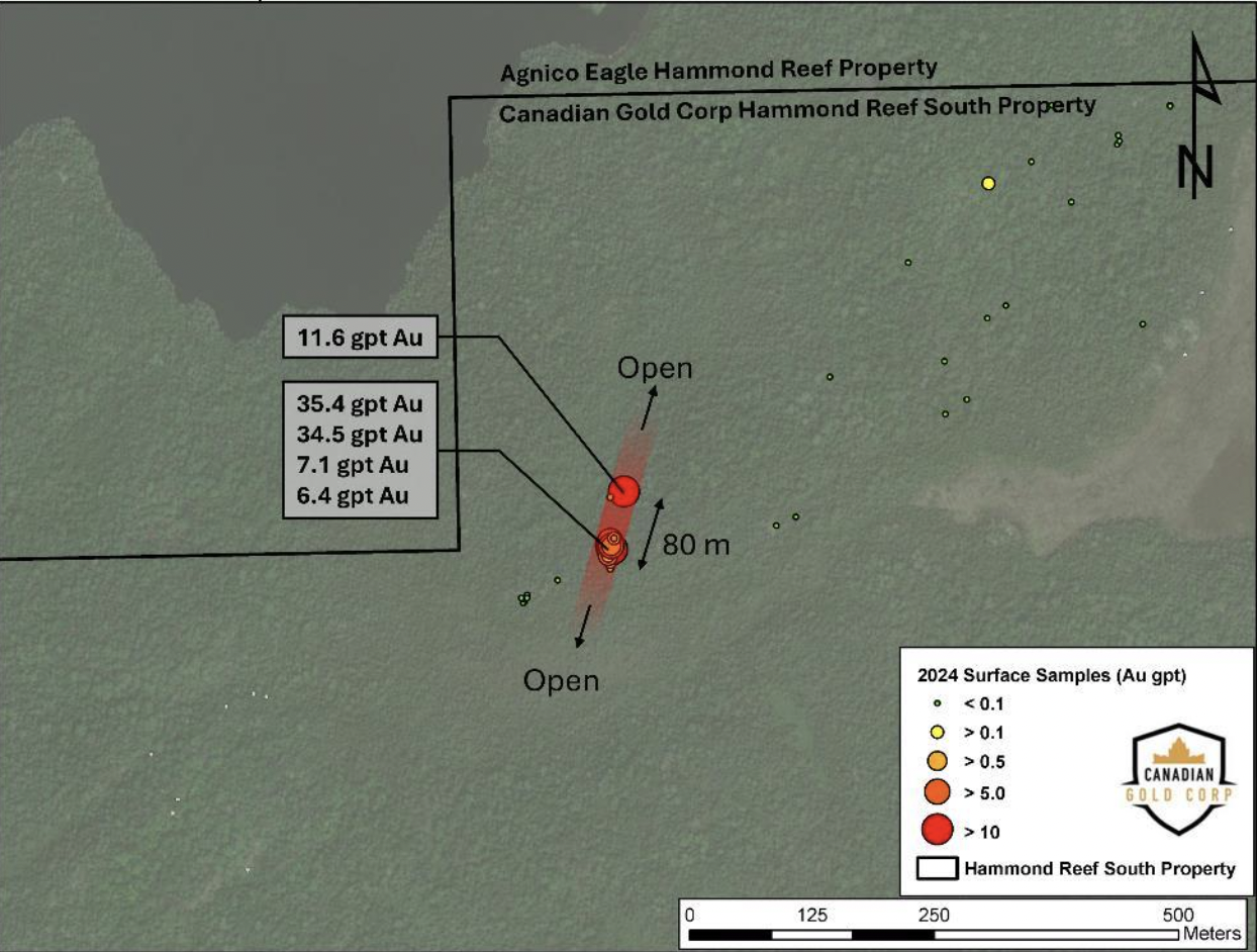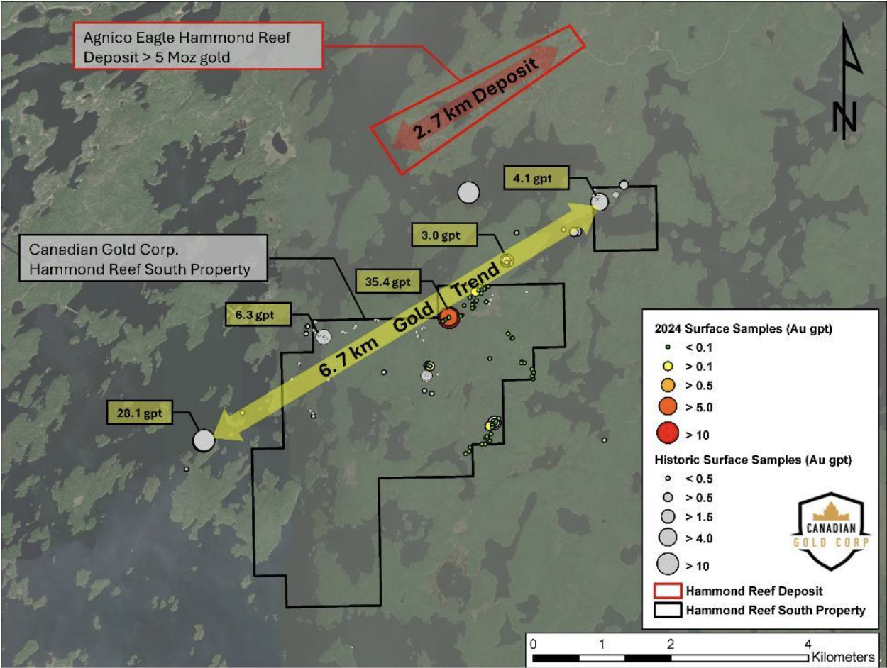 Last year’s program successfully identified a new high-grade gold zone with assays returning 35.4 gpt, 11.6 gpt, 7.1 gpt, and 2.9 gpt gold (see: September 25, 2024 CGC News Release). The Hammond Reef South property is located only 2 km from Agnico Eagle’s Hammond Reef Deposit, which contains a large mineral resource of more than 5 million ounces of gold and occurs in the same geological environment (Fig. 1). Exploration is currently focused on evaluating the extent of the gold system as well as the broader mineralized corridor that extends over a 6.7 km strike and parallel to Agnico Eagle’s Hammond Reef Deposit (Fig.1).