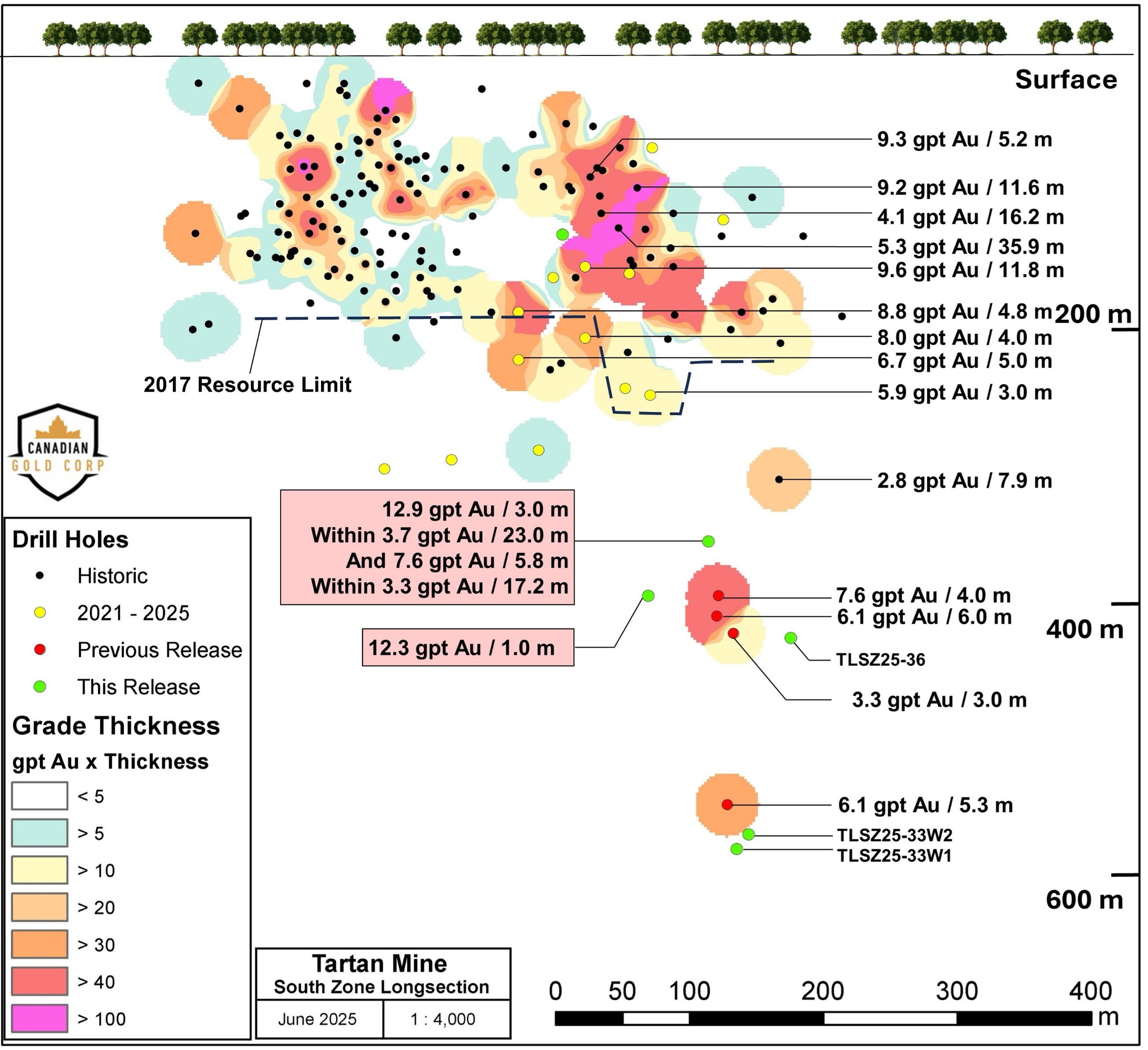 Flin Flon, Manitoba – June 10, 2025 – Canadian Gold Corp. (“Canadian Gold” or the “Company”) (TSX-V: CGC) is pleased to announce ongoing drill results from its Phase 4 drill program at the 100%-owned Tartan Mine, near Flin Flon, Manitoba. Results contained in this news release are from the South Zone, which is parallel to the Main Zone (Fig. 1, 2 & 3), and prior to the recent drilling, was planned as a supplemental source of potential ore for future production. However, our objective has been to expand the resource in this area to 1) increase the number of ounces per vertical metre, 2) allow for higher production in a potential mine restart, and 3) drive economies of scale in order to lower future production and development costs. Recent expansion results from the South Zone, which increased the vertical extent of the mineralization by 120%, included 9.4 gpt gold over 3.3 metres and 6.1 gpt gold over 6.0 metres.