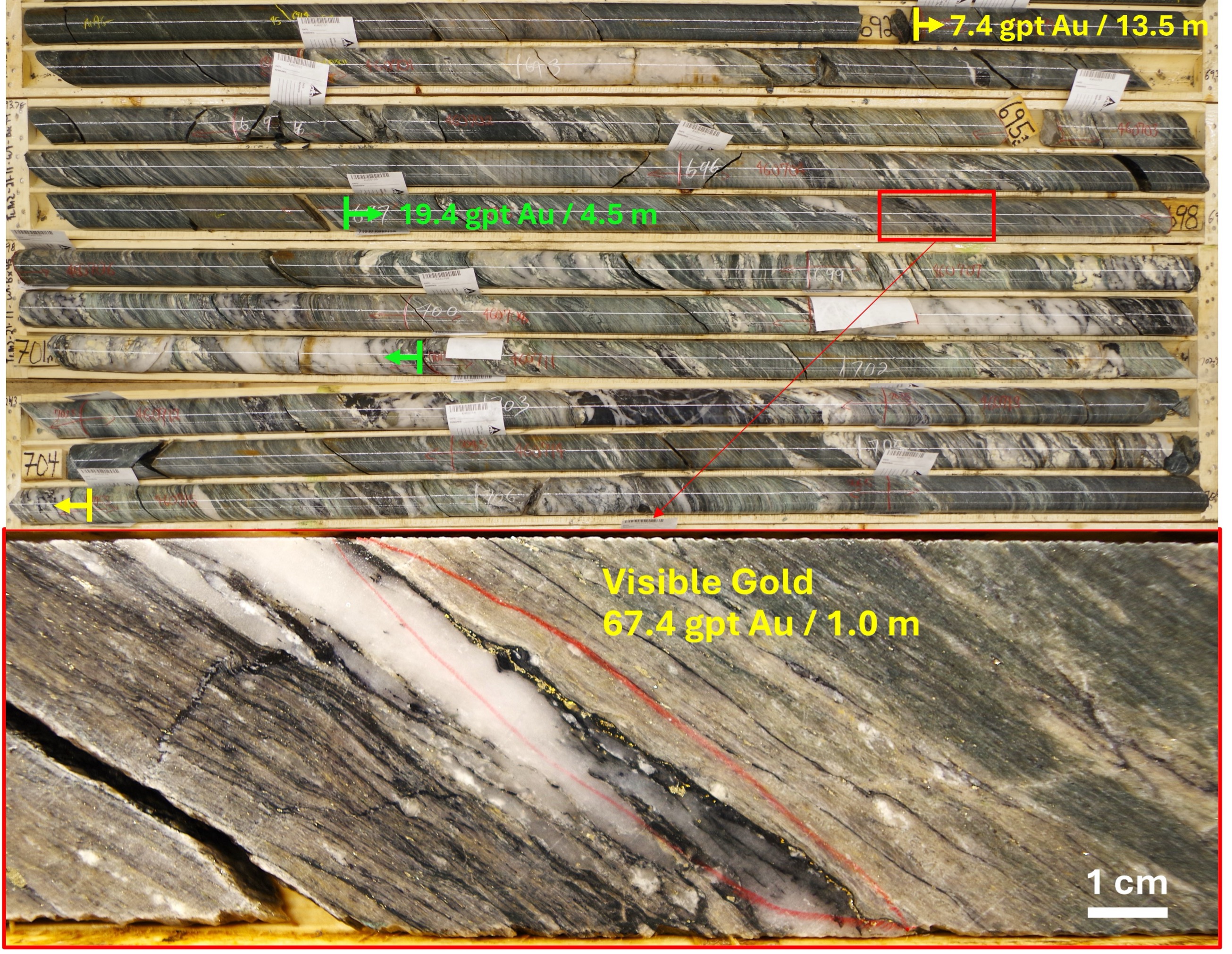- Hole TLMZ21-11W1 intersected a high-grade area of the Main Zone with significant visible gold (Fig. 2), returning 19.4 gpt gold over 4.5 metres within a wider interval of 7.4 gpt gold over 13.5 metres. This drill hole targeted a 90-metre gap in the Main Zone at 590 metres below surface, which was below the lower limit of the resource estimate (Fig. 1). Additional drilling of this area is warranted and could demonstrate a particularly rich part of the orebody that could potentially deliver increased gold grades and enhanced economics for the deposit.