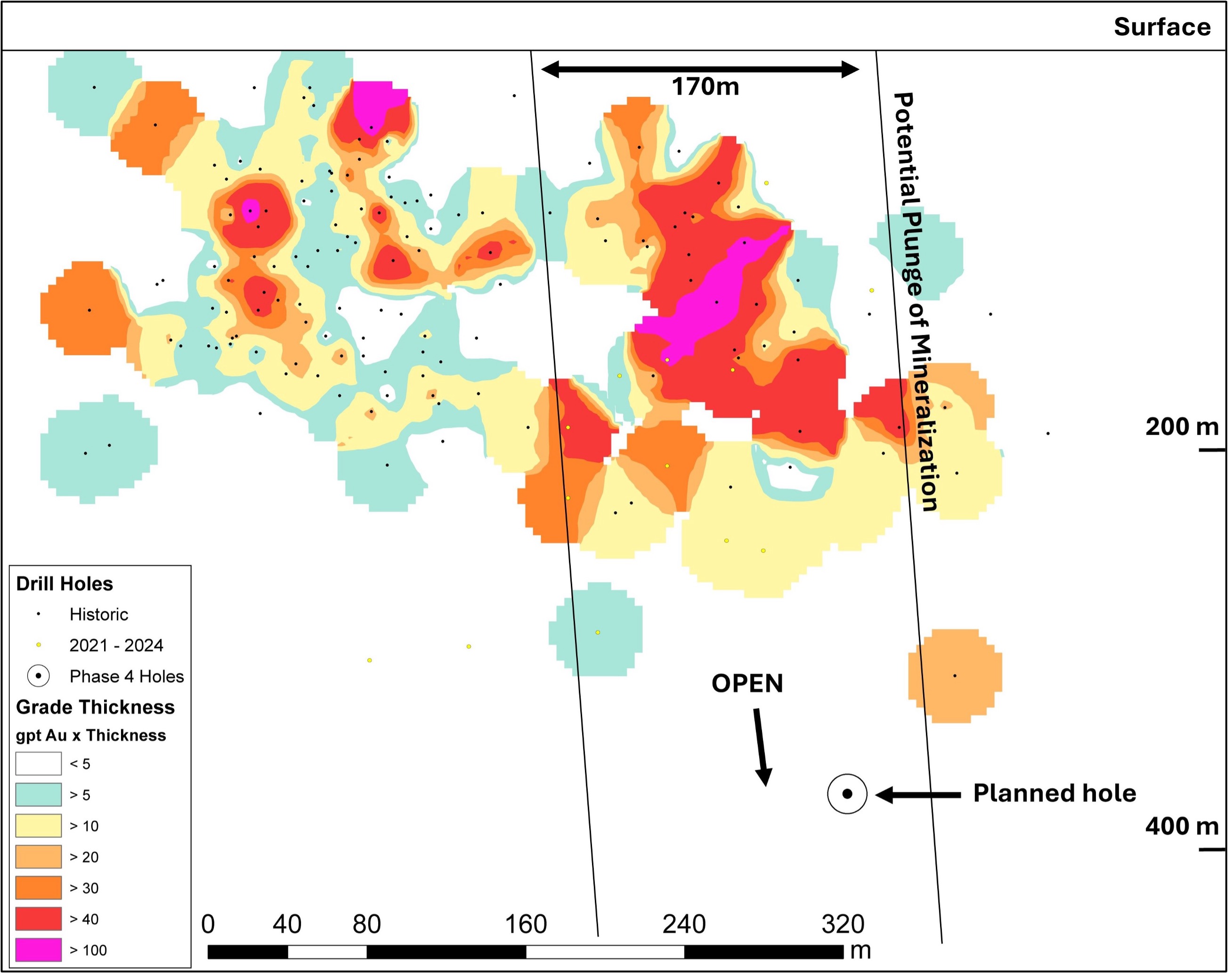 - Additional planned drilling for the Phase 4 program includes a deeper test of the South Zone, which is currently underway (Fig. 3), and two deep holes along the western flank of the Main Zone (Fig. 1). The drilling is designed to maximize the total potential gold ounces before the Company makes a decision on commencing an updated mineral resource estimate and mine economics study.